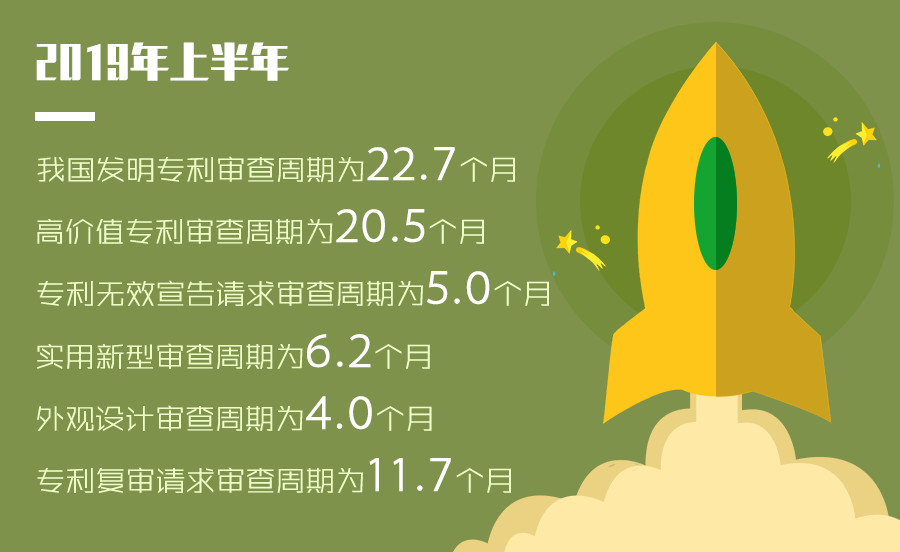 2019年上半年,我国发明专利审查周期为22.7个月,高价值专利审查周期为20.5个月,实用新型审查周期为6.2个月,外观设计审查周期为4.0个月,专利复审请求审查周期为11.7个月,专利无效宣告请求审查周期为5.0个月。