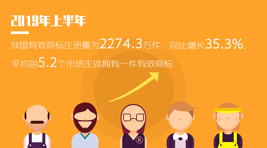 2019年上半年,我国商标注册申请量为343.8万件,同比下降4.1%;商标注册量为351.5万件,同比增长67.8%。截至6月底,我国有效商标注册量为2274.3万件,同比增长35.3%,平均每5.2个市场主体拥有一件有效商标。