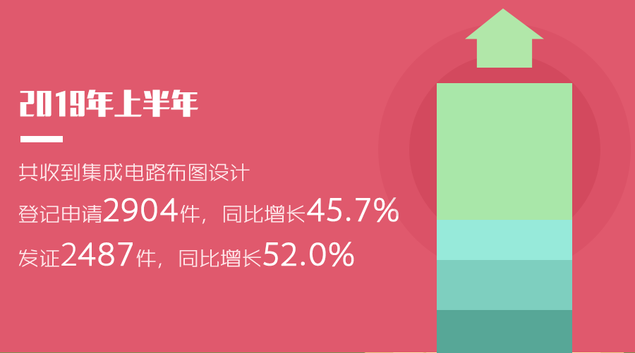 2019年上半年,共收到集成电路布图设计登记申请2904件,同比增长45.7%;发证2487件,同比增长52.0%。
