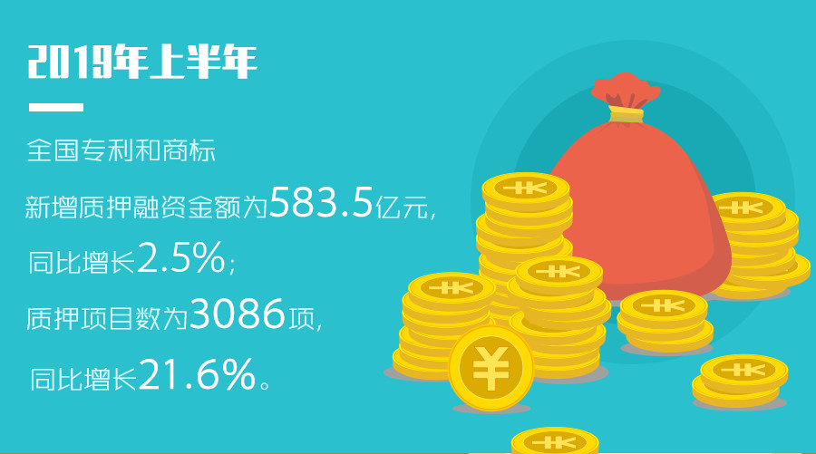 2019年上半年,全国专利和商标新增质押融资金额为583.5亿元,同比增长2.5%,质押项目数为3086项,同比增长21.6%。其中,专利质押融资金额为404亿元,质押项目2709项,涉及专利1.3万件。