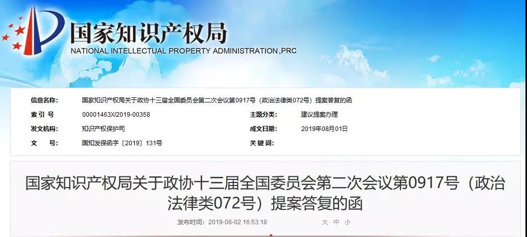 国家知识产权局关于政协十三届全国委员会第二次会议第0917号(政治法律类072号)提案答复的函