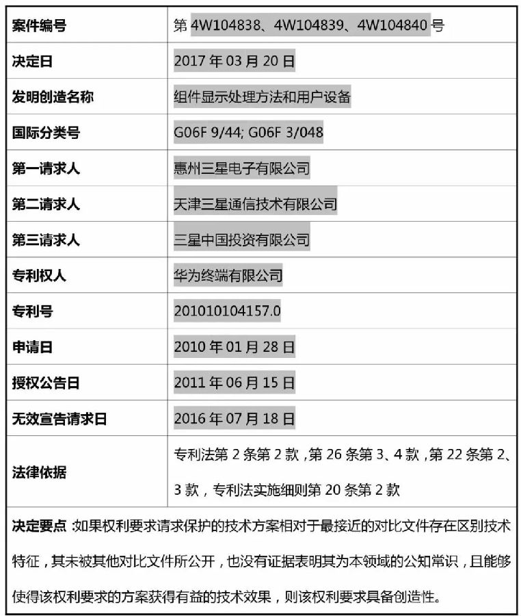 2016年7月18日,原告天津三星公司就华为公司持有的专利号为201010104157.0,专利名称为“组件显示处理方法和用户设备”的专利(简称涉案专利),以不属于专利保护的客体、缺少必要技术特征、说明书公开不充分、权利要求得不到说明书的支持、缺失新颖性、创造性等理由,向专利复审委员会提出无效宣告请求。三星(中国)投资有限公司、惠州三星电子有限公司亦针对涉案专利提起无效宣告请求,专利复审委员会并案审理。2017年4月7日,专利复审委员会作出第31835号决定(如表3所示),驳回了天津三星公司等三公司的全部无效请求,维持涉案专利有效。