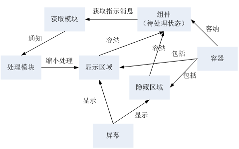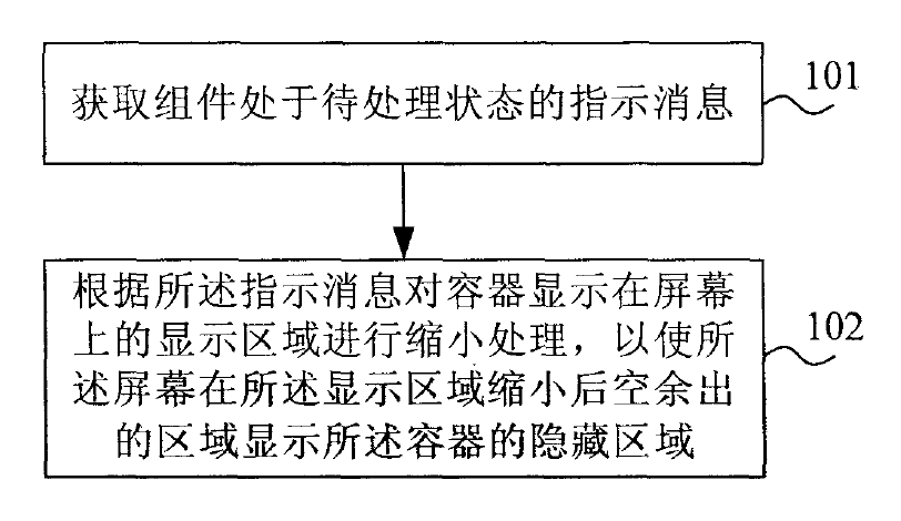 处理模块,用于根据所述指示消息对容器中显示在屏幕上的显示区域进行缩小处理,以使所述屏幕在所述显示区域缩小后空余出的区域显示所述容器的隐藏区域,所述容器包括容纳组件的显示区域和隐藏区域。”