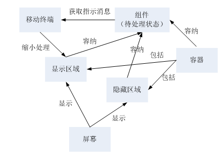 所述移动终端根据所述指示消息对容器中显示在屏幕上的显示区域进行缩小处理,以使所述屏幕在所述显示区域缩小后空余出的区域显示所述容器的隐藏区域,所述容器包括容纳组件的显示区域和隐藏区域。”