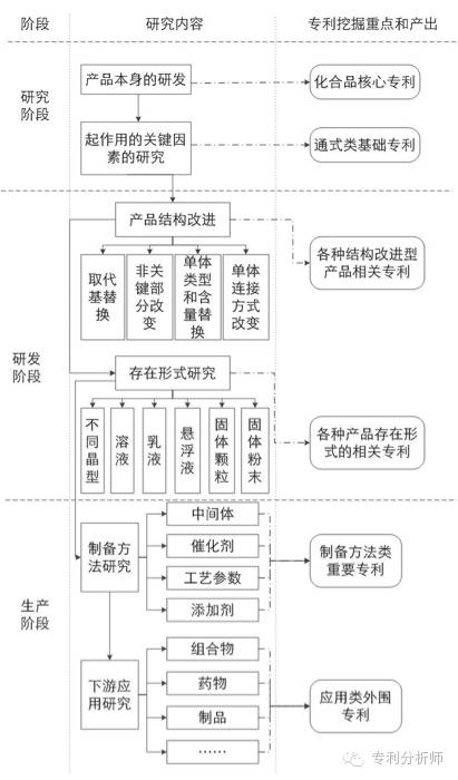 上图中,将化学产品的研究过程分为不同的阶段,例如,化学产品本身的研究、关键因素研究、改进研究、存在形式研究、制备方法研究和下游应用研究等多个阶段,对相应阶段主要的研究内容、专利挖掘的重点和产出的专利类型等进行了描述,读者可以参照图中所示进行化学产品的专利挖掘。