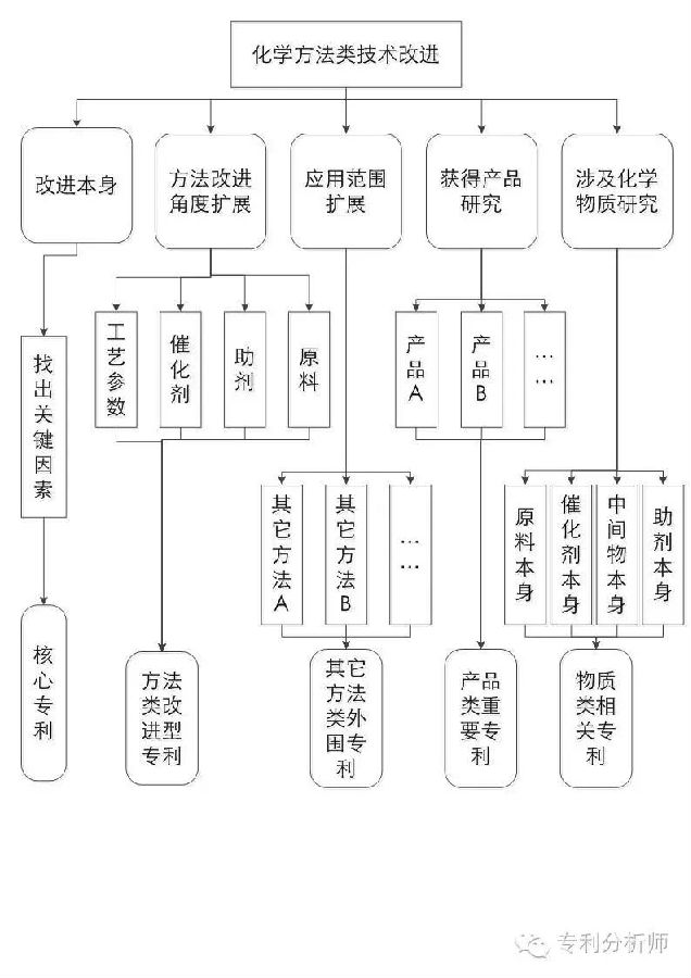 对于化学方法类的改进,需要从化学方法改进本身、改进角度扩展、应用范围扩展、获得产品研究、涉及化学物质研究等多个方面进行挖掘,得到各个方面的改进点,从而形成多个角度和类型的专利。