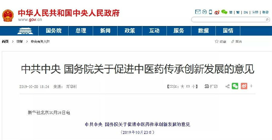 传承创新发展中医药是新时代中国特色社会主义事业的重要内容,是中华民族伟大复兴的大事,对于坚持中西医并重、打造中医药和西医药相互补充协调发展的中国特色卫生健康发展模式,发挥中医药原创优势、推动我国生命科学实现创新突破,弘扬中华优秀传统文化、增强民族自信和文化自信,促进文明互鉴和民心相通、推动构建人类命运共同体具有重要意义。为深入贯彻习近平新时代中国特色社会主义思想和党的十九大精神,认真落实习近平总书记关于中医药工作的重要论述,促进中医药传承创新发展,现提出如下意见。