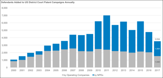 直到2017年美国对专利侵权案的起诉地域管辖规则进行了调整之后,专利诉讼案件才跌到了4000件以下,NPE发起的专利诉讼跌到了2000件以下。