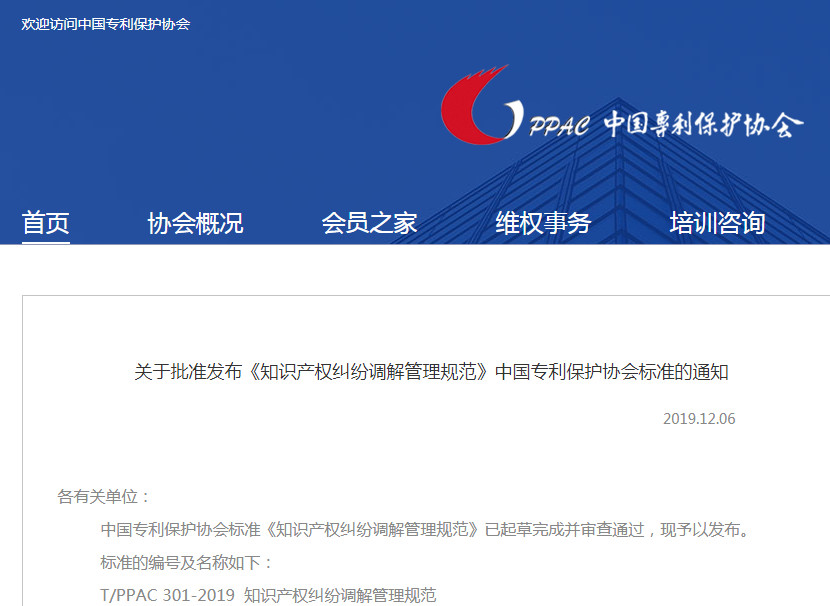 近日,中国专利保护协会网站发布了“关于批准发布《知识产权纠纷调解管理规范》中国专利保护协会标准的通知”,标准规定了知识产权纠纷调解的基本原则、受理、策划、实施、卷宗管理。适用于人民调解委员会依知识产权纠纷相关当事人申请进行调解的,或者经相关当事人同意进行调解的。受人民法院、公安机关、知识产权行政机关等委托进行调解的,可以参照本标准执行。