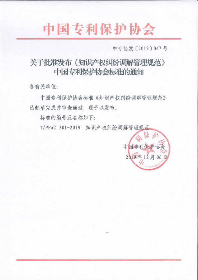 附件:1.关于批准发布《知识产权纠纷调解管理规范》中国专利保护协会标准的通知
