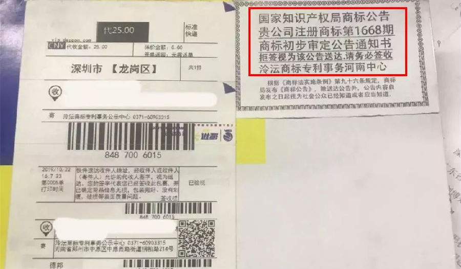 不过有一说一,河南泠沄专利代理中心的官方地址和快递单上的泠沄专利中心也并不是完全对应,所以是否真的是这家公司目前也都只能是推测。而最关键的问题在于,这份写着“拒签视为改公告送达,请务必签收”的快递为货到付款。