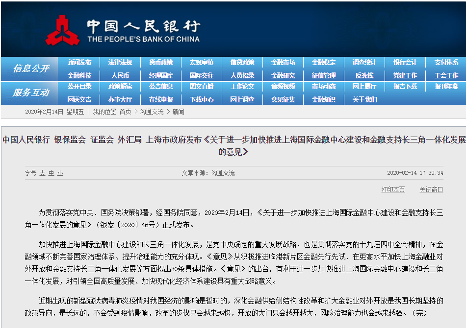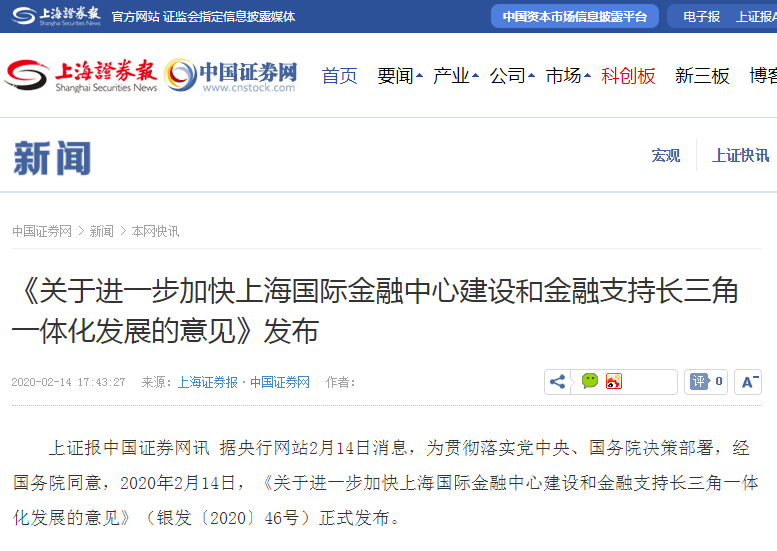 为贯彻落实党中央、国务院决策部署,经国务院同意,2020年2月14日,《关于进一步加快推进上海国际金融中心建设和金融支持长三角一体化发展的意见》(银发〔2020〕46号)正式发布。