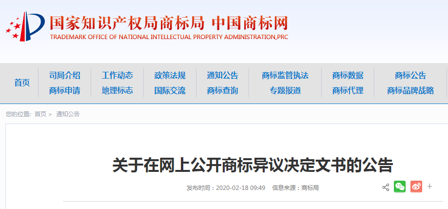 为增强商标异议审查工作的透明度,加强社会监督,促进依法行政,我局决定自2020年1月1日起在网上公开商标异议决定。