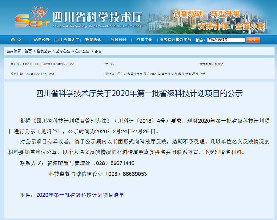 根据《四川省科技计划项目管理办法》(川科计〔2018〕4号)要求,现对2020年第一批省级科技计划项目进行公示(见附件),公示时间为2020年2月24日-2月28 日。