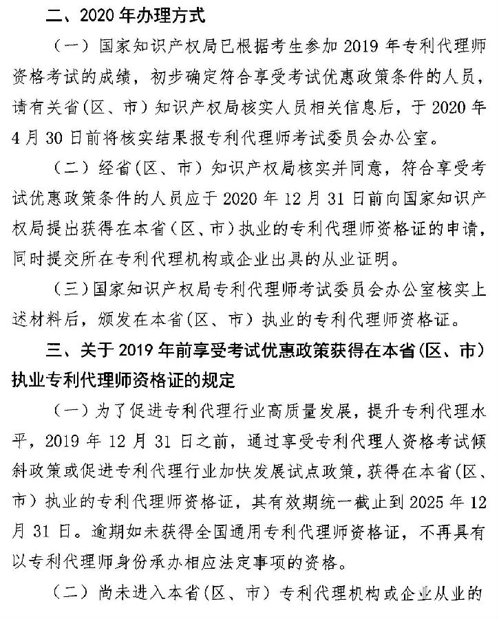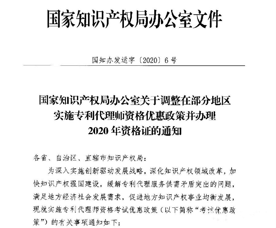 经研究,国家知识产权局专利代理师考试委员会决定,根据专利代理行业发展需要,在当年考试合格分数线的基础上,对符合条件的部分省(区、市)下浮一定分数,确定享受考试优惠政策的分数线。对于满足条件且在专利代机构或企业从业的考生,由国家知识产权局颁发允许在本省(区、市)执业的专利代理师资格证。考试优惠政策的实施期限暂定为3年,截至到2022年12月31日。
