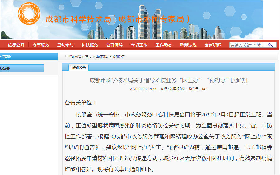 成都市科学技术局关于倡导科技业务“网上办”“预约办”的通知