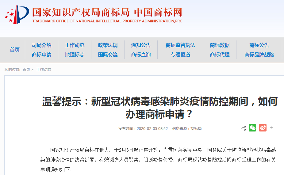 国家知识产权局商标注册大厅于2月3日起正常开放。为贯彻落实党中央、国务院关于防控新型冠状病毒感染的肺炎疫情的决策部署,有效减少人员聚集,阻断疫情传播,商标局现就疫情防控期间商标受理工作的有关事项通知如下: