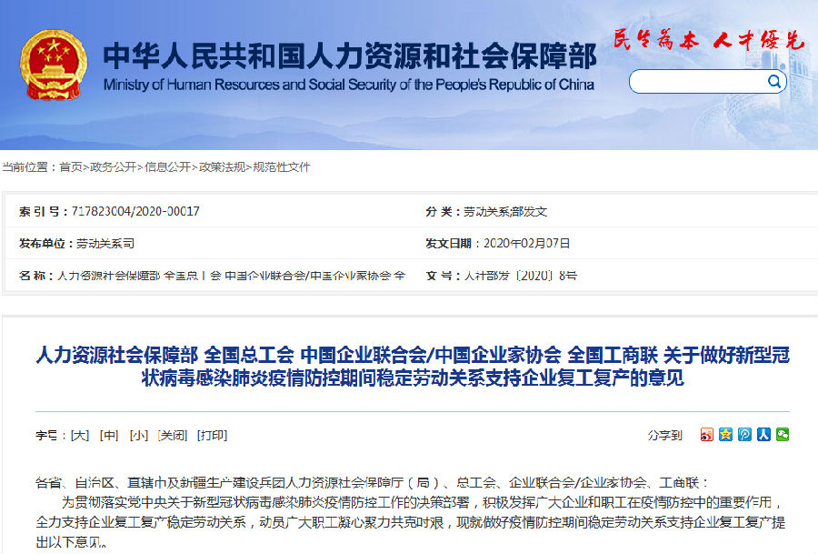 人力资源社会保障部 全国总工会中国企业联合会/中国企业家协会全国工商联关于做好新型冠状病毒感染肺炎疫情防控期间稳定劳动关系支持企业复工复产的意见