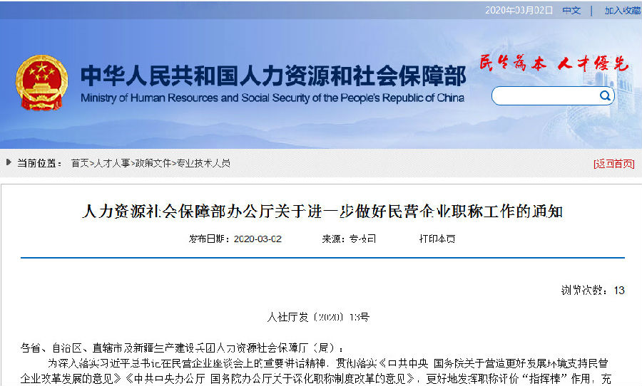 3月2日,人力资源社会保障部办公厅发布《关于进一步做好民营企业职称工作的通知》,通知强调:民营企业职称评审标准要充分体现民营企业专业技术人才特点和工作实际,贴近民营企业用人需求。进一步克服唯学历、唯资历、唯论文、唯奖项倾向,突出工作能力和业绩考核,注重市场认可和对企业的实际贡献。对论文、职称外语等不做限制性要求,专利成果、技术突破、工艺流程、标准开发、成果转化等均可作为职称评审的重要内容。