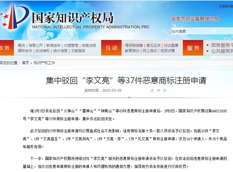 集中驳回“李文亮”等37件恶意商标注册申请