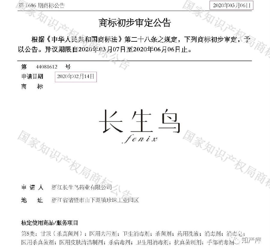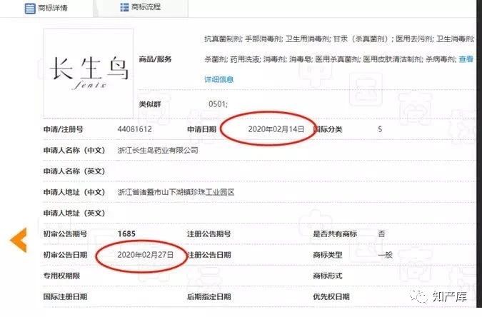 今天的主角,44081612号“长生鸟”商标,申请人是浙江长生鸟药业有限公司,这一家省级疫情防控重点保障企业。