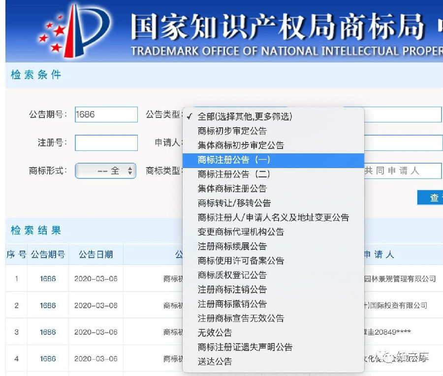 商标初审公告、注册公告最为常见,其他还有商标变更公告、转让公告、续展公告、许可备案公告、注销公告、无效公告、送达公告等......