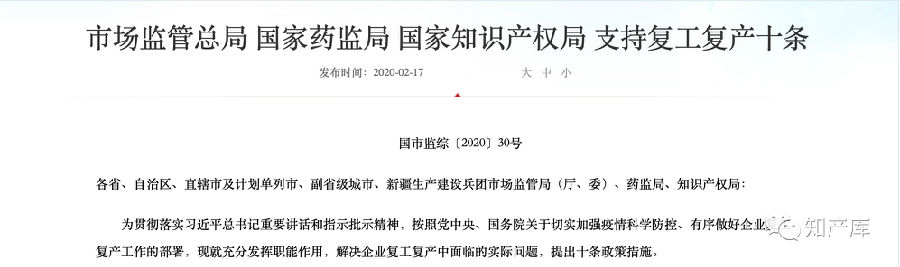 2月15日,《市场监管总局 国家药监局 国家知识产权局支持复工复产十条》: