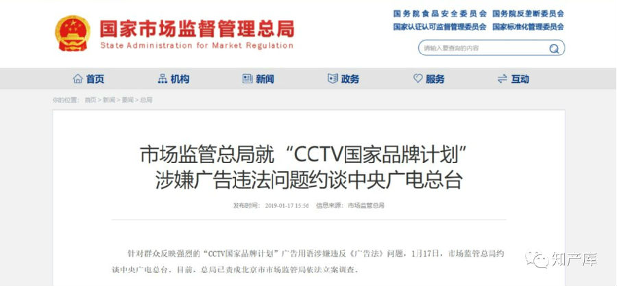 2019年1月17日,国家市场监管总局发布公告称,就“CCTV国家品牌计划”涉嫌广告违法问题约谈中央广电总台: