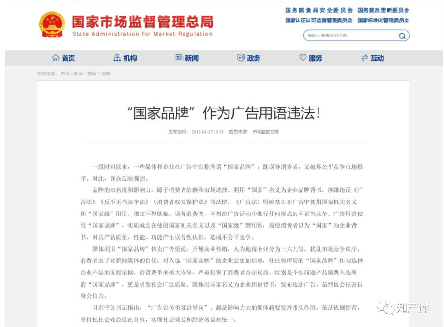 2019年1月17日,国家市场监管总局发布《“国家品牌”作为广告用语违法!》: