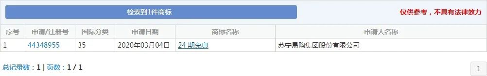 2020年3月4日,苏宁易购向商标局申请注册第44348955号“24期免息”商标,该商标注册在第35类广告销售类。目前该商标还处于审查阶段。