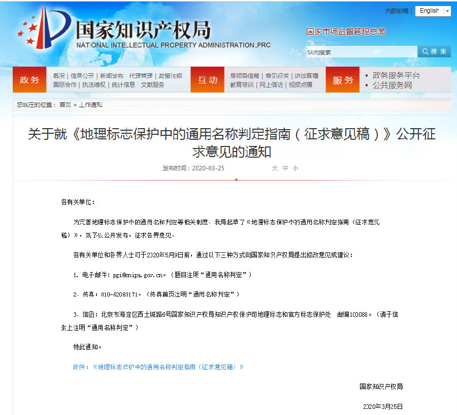 关于就《地理标志保护中的通用名称判定指南(征求意见稿)》公开征求意见的通知