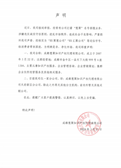 近日,协会收到举报,经常有公司打着协会理事单位“慧聚”名号招揽生意,涉嫌违反诚实守信原则,扰乱市场秩序,严重影响协会理事单位“成都慧聚知识产权代理有限公司”的声誉。协会在此提醒各单位、各企业提高警惕,认真辨识,以免上当受骗。