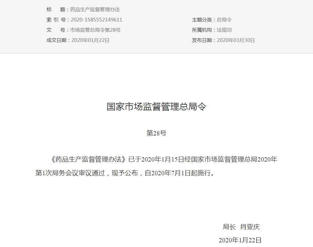 药品生产监督管理办法(2020年1月22日国家市场监督管理总局令第28号公布)