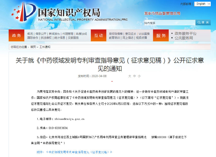 为贯彻落实党中央、国务院《关于促进中医药传承创新发展的意见》的精神,进一步做好中医药领域专利申请的审查工作,国家知识产权局起草形成了《中药领域发明专利审查指导意见(征求意见稿)》(以下简称“征求意见稿”)。现就该征求意见稿向社会公开征求意见,有关单位和各界人士可于2020年4月22日前,选择以下方式中的一种,围绕征求意见稿的修改完善提出具体意见: