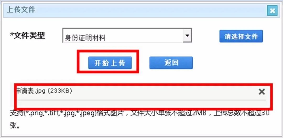 选中的图片被加在到上传文件列表中,点击“开始上传”。