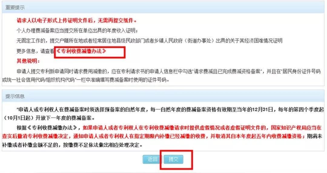 6.页面展示出费减备案享受的权利以及重要提示,此页信息提交成功后可以在查看页面打印,点击“提交”。