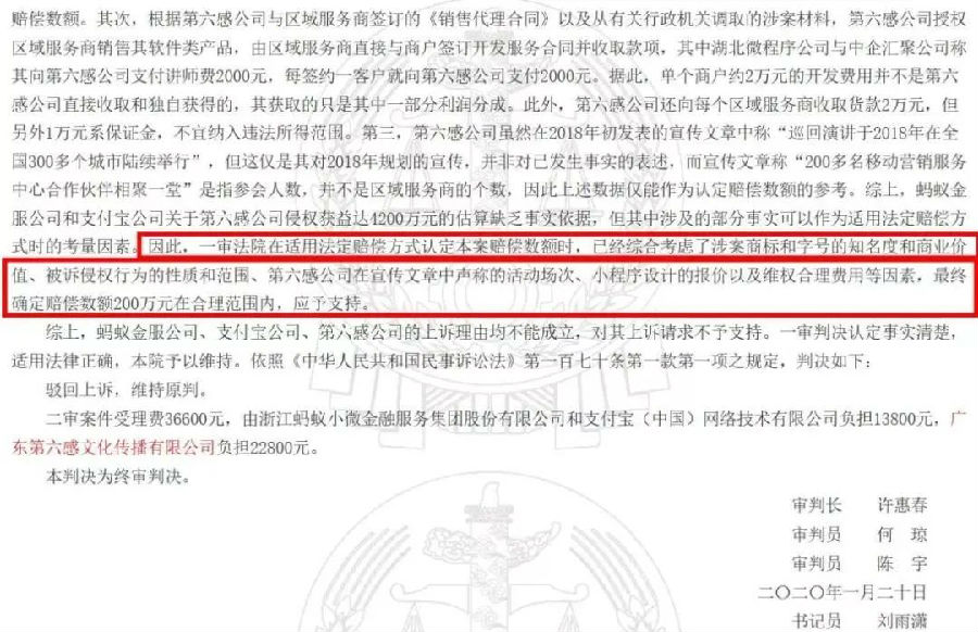 在接到多起用户咨询和举报后,支付宝展开调查、举证,于2018年5月起诉第六感公司商标侵权和不正当竞争。2019年5月30日,杭州中院一审判决第六感公司立即停止侵权,并就侵权事实在媒体刊登声明为蚂蚁金服、支付宝消除影响,同时赔偿蚂蚁金服、支付宝经济损失等共计200万元。