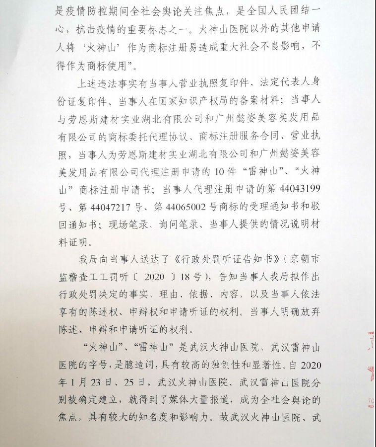 01、北京慷忱国际知识产权代理有限公司因代理“火神山”等商标,罚款10万元