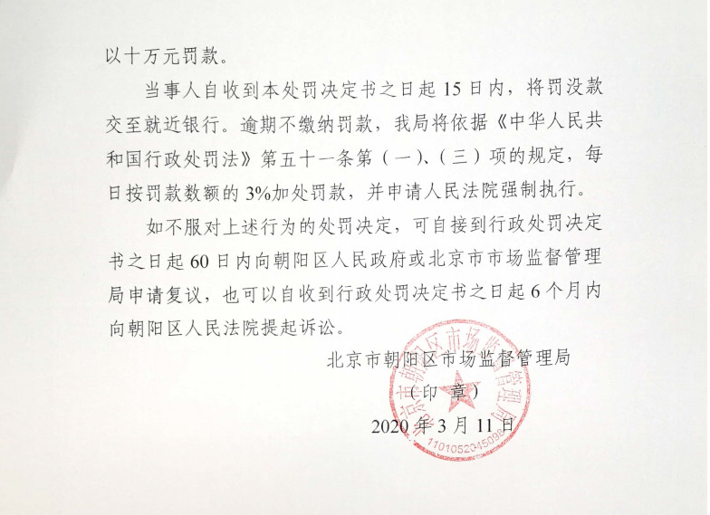 依据《中华人民共和国商标法》六十八条第一款第(三)项的规定,朝阳区市场监管局于2020年3月11日,向当事人送达《行政处罚决定书》(京朝市监工罚〔 2020 〕166号),责令当事人立即停止违法行为,并作出行政处罚决定如下:一、给予警告;二、对当事人处以十万元罚款。