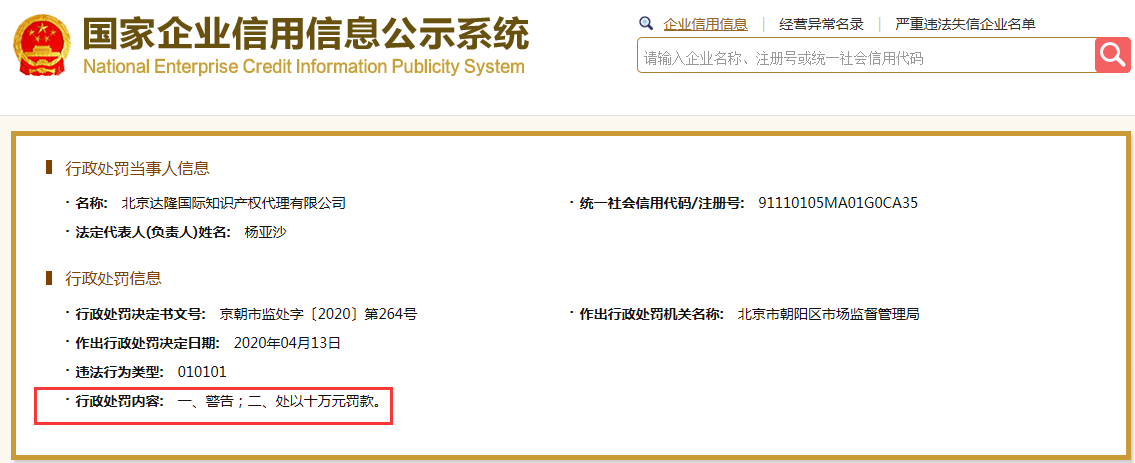 04、北京达隆国际知识产权代理有限公司因代理“钟南山”等商标,罚款10万元