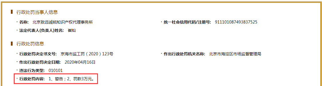 07、北京致远诚铭知识产权代理事务所因代理“火神山”等商标,罚款3万元