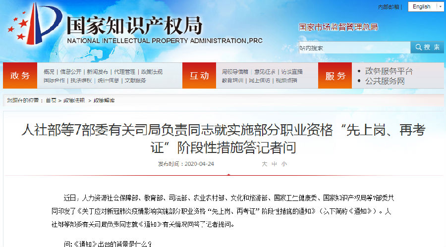 近日,人力资源社会保障部、教育部、司法部、农业农村部、文化和旅游部、国家卫生健康委、国家知识产权局等7部委共同印发了《关于应对新冠肺炎疫情影响实施部分职业资格“先上岗、再考证”阶段性措施的通知》(以下简称《通知》)。人社部等部委有关司局负责同志就《通知》有关情况回答了记者提问。