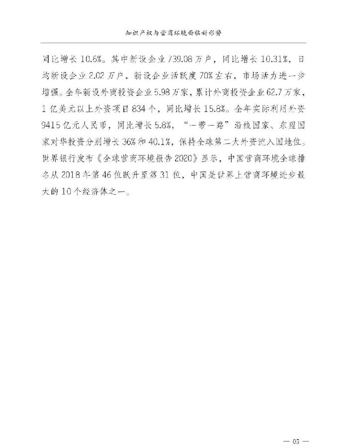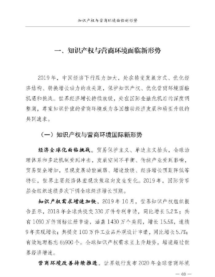 中国保护知识产权、优化营商环境的不懈努力获得国际社会赞誉。世界知识产权组织发布《2019年全球创新指数》显示,中国位列14,较2018年上升3个位次。世界银行发布《全球营商环境报告2020》显示,中国排名从2018年的第46跃升至第31位。