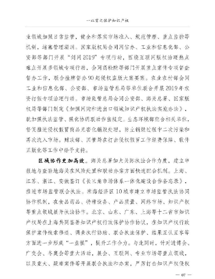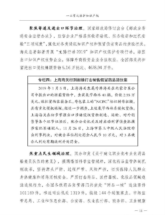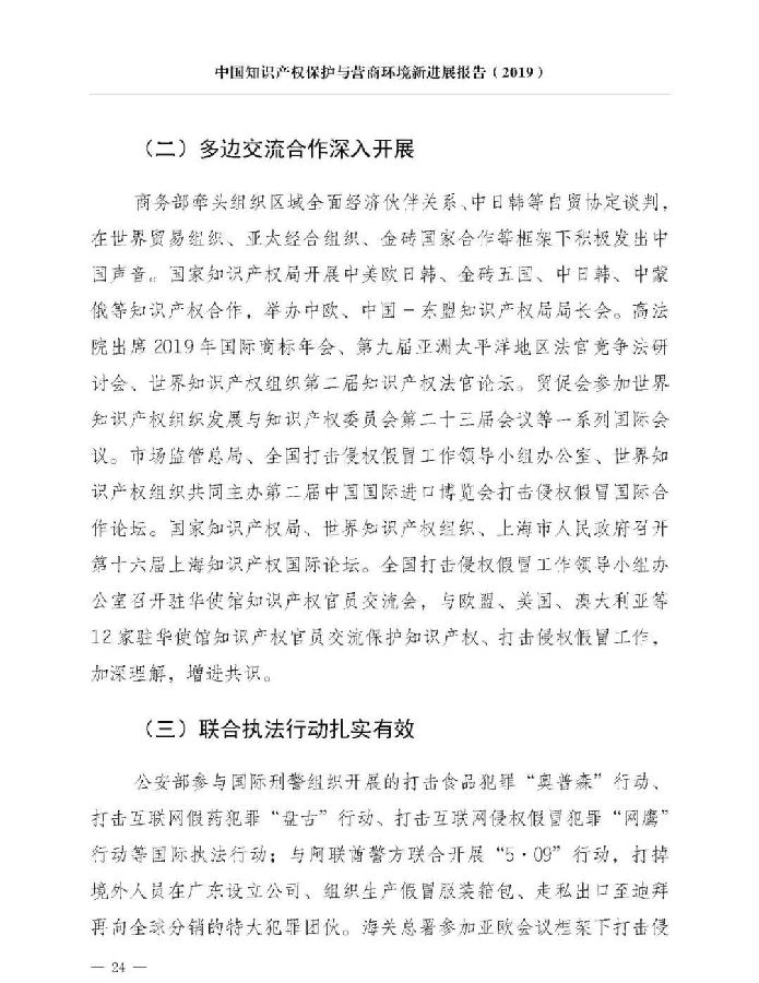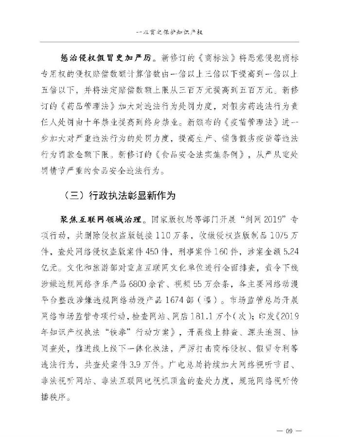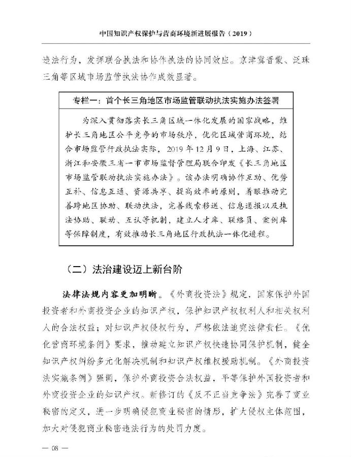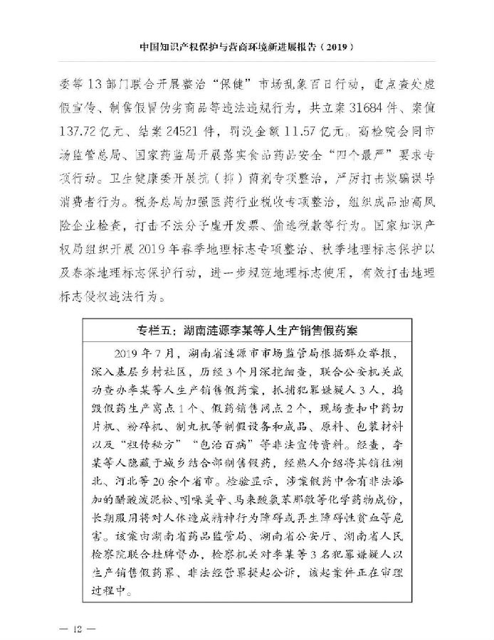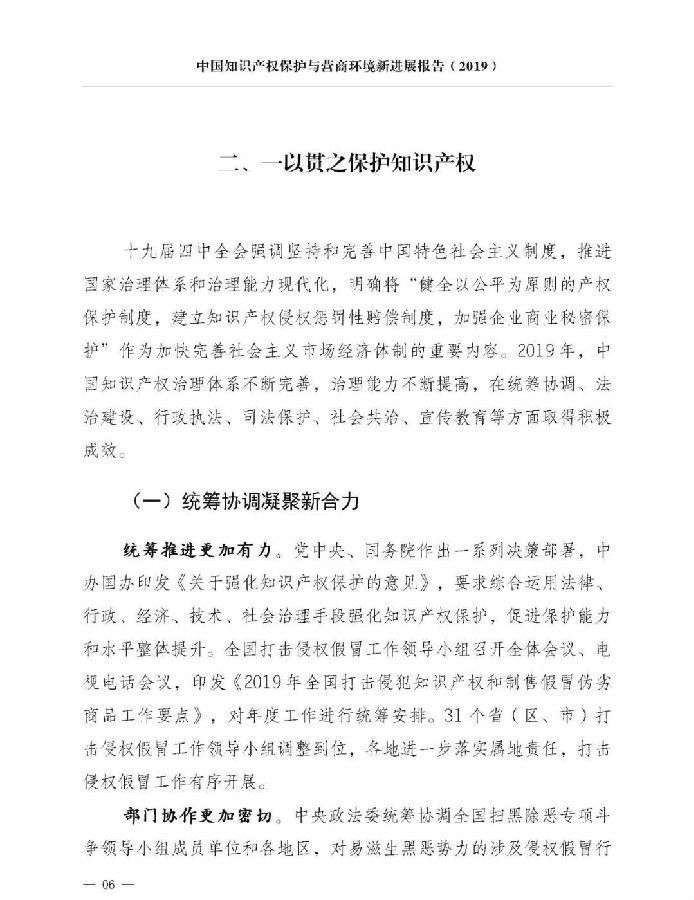 一是统筹谋划推动取得新进展。顶层设计方面,出台《关于强化知识产权保护的意见》,综合运用法律、行政、经济、技术、社会治理手段强化知识产权保护。法治建设方面,修订《商标法》《反不正当竞争法》《药品管理法》,进一步提高侵权行为处罚力度,新颁布实施《外商投资法》及其实施条例、《优化营商环境条例》等多部法律法规。体制机制方面,31个省(区、市)打击侵权假冒工作领导小组全部调整到位,形成横向协作、纵向联动的打击侵权假冒工作格局。