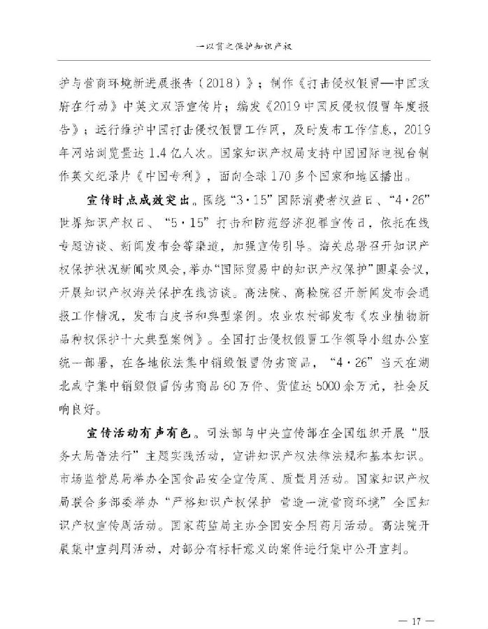 二是知识产权保护取得新进展。行政执法方面,聚焦互联网领域、农村市场、寄递及进出口环节、重点民生领域,开展“剑网”“龙腾”“铁拳”“农资打假”等专项行动。司法保护方面,公安部部署开展“昆仑行动”,严厉打击侵权假冒犯罪;法院系统推进知识产权审判机制改革,检察机关强化诉讼监督职能,司法保护更加高效、更具针对性。社会共治方面,持续推进维权协作,及时化解侵权纠纷,不断深化行业自律,知识产权服务水平和社会维权意识进一步提升。国际合作方面,积极参加国际组织开展的“奥普森”“盘古”“网鹰”“健康女神”等专项行动,严厉打击网络和跨境侵权假冒犯罪,取得积极战果。