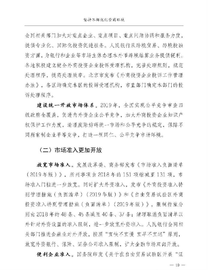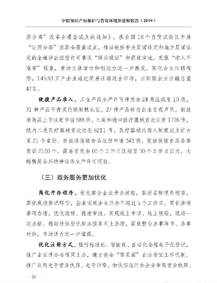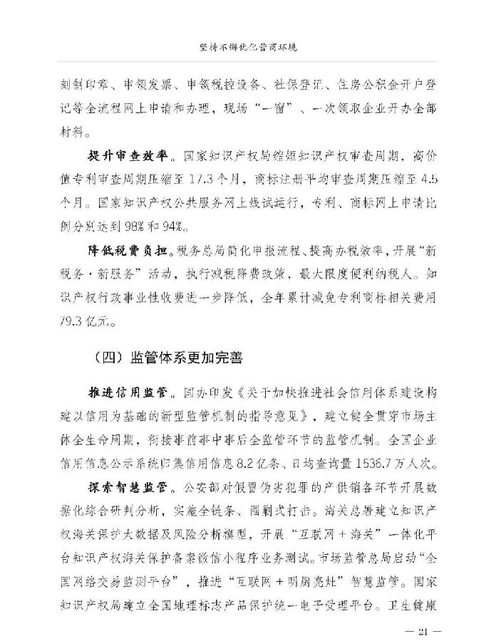 三是营商环境优化取得新进展。投资贸易更加便捷,新设6个自贸试验区,举办大型交易会、博览会,修订、废止400多部与外商投资法不符的法规及相关规定。市场准入更加开放,进一步缩减市场准入负面清单、外商投资准入负面清单所列事项,压缩工业产品生产许可种类。政务服务更加优化,简化企业注册程序,推行全程网上办理,新办企业基本实现不超过5个工作日。提高知识产权审查效率、缩短审查周期,降低知识产权行政事业性收费。监管体系更加完善,大力推进信用监管,探索智慧监管,深化“双随机、一公开”监管,打造公平竞争、诚信经营的市场环境。