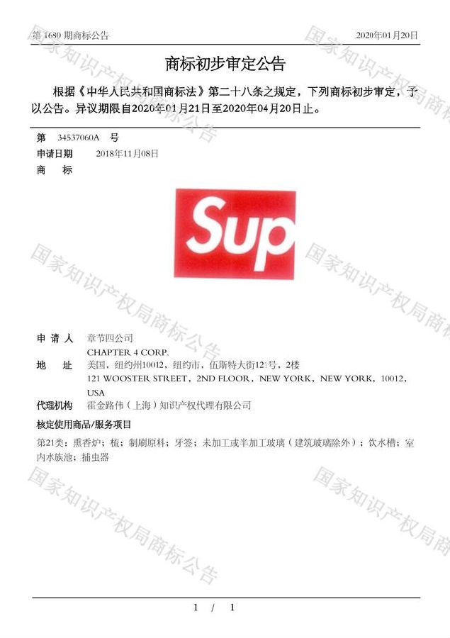 5月6日,中国商标局发布公告显示,美国潮牌Supreme已注册商标“SUPREME NEW YORK”。据界面新闻报道,Supreme从2019年11月起,便陆续在中国获批一系列商标,如“SUP”和“SUPREME”。这些商标的申请人“章节四公司(Chapter 4)”是Supreme品牌的知识产权所有人。