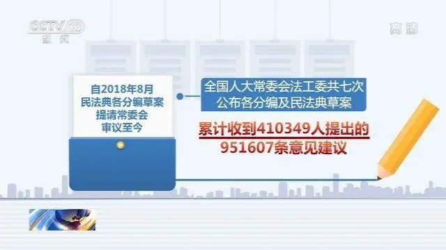 据统计,自2018年8月民法典各分编草案提请常委会审议至今,全国人大常委会法工委共七次公布各分编及民法典草案,累计收到410349人提出的951607条意见建议。