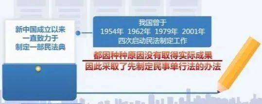 新中国成立以来,一直致力于制定一部民法典,我国曾于1954年、1962年、1979年和2001年四次启动民法制定工作,都因种种原因没有取得实际成果,因此采取了先制定民事单行法的办法。