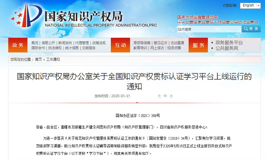 国家知识产权局办公室关于全国知识产权贯标认证学习平台上线运行的通知各省、自治区、直辖市及新疆生产建设兵团知识产权局(知识产权管理部门),四川省知识产权服务促进中心: 为进一步落实《关于规范知识产权管理体系贯标认证工作的通知》(国知发管字〔2019〕34号),汇聚有效学习资源,规范培训学习渠道,助力知识产权贯标认证辅导咨询和培训服务转型升级,我局定于2020年5月15日正式上线全新的开放式知识产权贯标认证学习平台(以下简称“学习平台”)。现就有关事项通知如下。 学习平台是贯彻落实党中央、国务院关于深化“放管服”改革、转变政府职能要求,由我局组织建设的全国性知识产权贯标认证工作综合服务载体,旨在满足各类创新主体开展知识产权贯标认证工作日益增长的学习需求,提供精准化的学习方式。 学习平台面向企业、高等学校、科研组织等创新主体,以提供公益化、便利化线上服务为主,开设在线学习测评、政策汇集发布、典型样例分享、监督反馈投诉等功能模块,帮助各类创新主体建立完善知识产权管理体系,打造“人人皆学、处处能学、时时可学”的知识产权贯标认证学习模式。平台支持PC端和手机端访问,平台网址为:http://www.ipmsstudy.cn,详情请登录查看使用说明。 (一)宣贯解读政策信息。开设政策信息专栏,汇集国家和地方知识产权贯标认证惠企相关政策及解读,帮助创新主体用好相关政策,获得相关支持。 (二)统一规范在线培训。开设学习测评专栏,科学设计贯标认证全流程学习课程,免费提供权威师资授课资源,在线检验巩固学习成效,实时提升相关人员从业技能。 (三)分类共享实践样例。开设贯标样例专栏,按领域和规模分类提供高质量贯标实践样例,帮助创新主体量身建立知识产权管理体系并高质量运行。 (四)公示监督认证服务。开设认证服务专栏,公示知识产权认证机构服务标准,支持创新主体择优选择认证服务,线上评估反馈服务质量,促进服务标准持续提升。 (一)加大宣传推广力度。要高度重视发挥平台作用,将学习平台作为服务创新主体的重要抓手,结合实际组织动员省市县各级辖区内的企业、高校和科研组织使用好学习平台,及时反馈意见建议,切实解决创新主体实际困难,全力支持复工复产。我局将通过学习平台后台管理功能及时汇总通报各地使用情况。 (二)加强数据使用管理。要依托学习平台后台管理端口,综合管理使用好后台数据信息,跟踪了解创新主体学习情况和内在需求,对知识产权产出质量、运用效益、保护水平等方面取得的成效进行关联分析,靶向精准服务创新主体,提高知识产权管理体系贯标认证有效性。 (三)持续完善政策体系。请按照关于规范知识产权管理体系贯标认证工作的通知精神及时与我局联系,在学习平台上补充、更新辖区内知识产权贯标认证相关政策,进一步完善学习平台知识产权贯标认证政策库,为创新主体提供更加全面高效便捷服务。郎宏鹏 谷云飞 010—62083189 62086032
